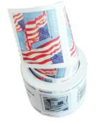 Flag 2022 Forever stamps. Originally issued by the post office on January 9, 2022. The stamp art is a painting of three flags in a circular formation, reminiscent of the 50 flags encircling the Washington Monument. The artist used three separate photographs of the same flag taken seconds apart as a reference and stitched together the images into a single composition.